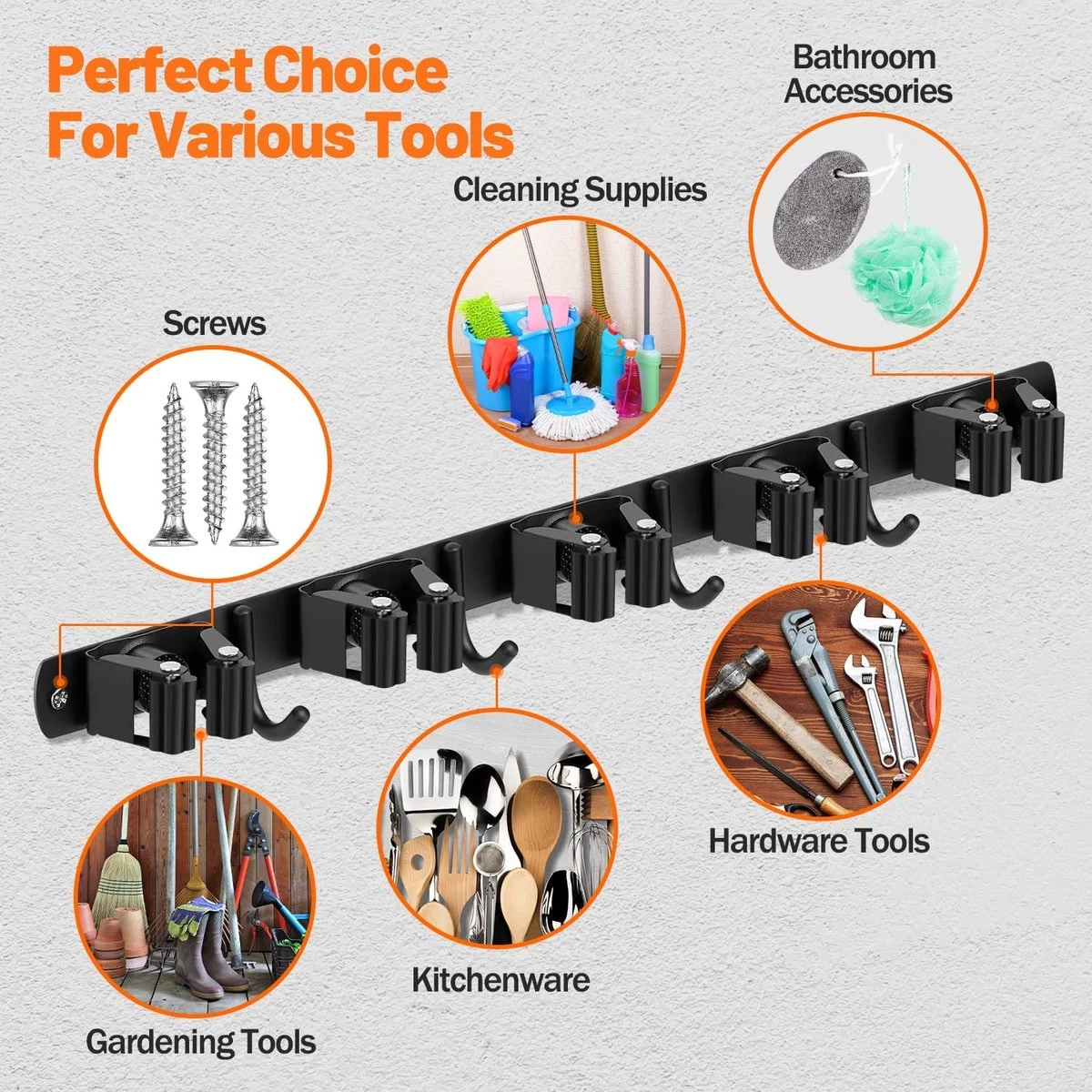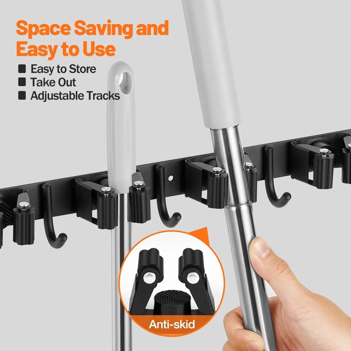Ruimtebesparend en gemakkelijk te gebruiken: Met 5 rekken en 6 haken biedt deze bezemhouder-muurbevestiging in totaal 9 ophangposities voor uw gereedschap, waardoor uw ruimte maximaal wordt bespaard. Zodra u de bezemsteel in de driehoekige clip klemt, past deze automatisch in de verschillende diktes van de handgrepen en vergrendelt deze zonder te schuiven. Dankzij de siliconen tandwielrol kun je hem er gemakkelijk uithalen door de handgrepen op te tillen.