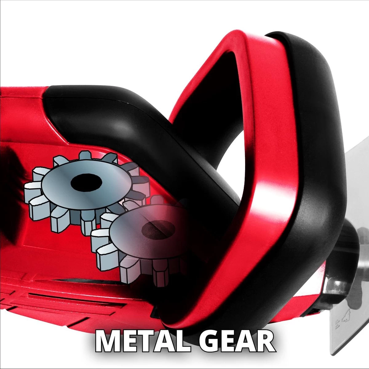 Om een lange levensduur van de machine te bevorderen en een snelle slijtage aan onderdelen tegen te gaan is de machine voorzien van een metalen tandwielaandrijving. Een veilige manier van werken wordt bevorderd door de tweehandige veiligheidsschakelaar op de accu heggenschaar. Bij het loslaten van de schakelaar staan de messen van de machine binnen een seconde stil. Het mes van de machine wordt beschermd door een aluminium mesafdekking over de messen van de accu heggenschaar. Aan de voorzijde van de accu heggenschaar zit een handige stootbeschermer met houder voor de wandmontage. Hang de machine bijvoorbeeld op aan een spijker of schroef in de muur.
