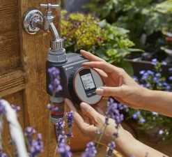 Met de Gardena besproeiingscomputer Flex kan de irrigatie op balkons, dakterrassen of patio’s flexibel en eenvoudig automatisch worden geregeld. Het apparaat werkt op batterijen, kan direct op de kraan worden aangesloten en kan eenvoudig worden bediend via een innovatieve roterende knop voor de selectie van een programma en het bevestigen ervan. Een gemakkelijk leesbaar display toont alle instellingen in één oogopslag. Het weerbestendige bedieningspaneel kan worden verwijderd. Met de besproeiingscomputer Flex kunnen de besproeiingstijden in cycli van seconden worden aangepast, waardoor ze ideaal zijn voor gebruik met een druppelsysteem. Het is mogelijk om deze waterregeling te combineren met een Gardena bodemvochtigheidssensor.