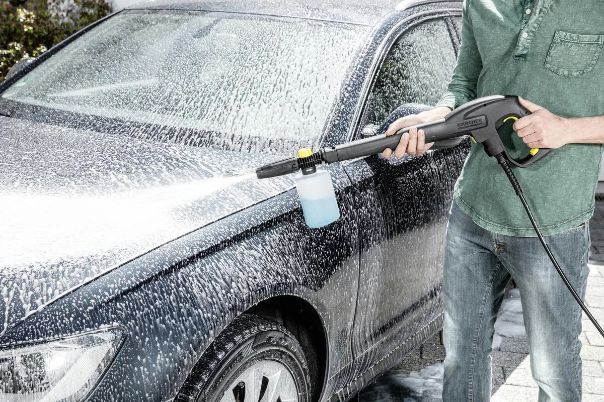 FJ 6 schuimsproeier met extra krachtig schuim voor een eenvoudige reiniging van alle oppervlakken zoals verf, glas en steen. Ideaal voor de reiniging van voertuigen, wintertuinen, tuinmeubelen, gevels, trappen, caravans, paadjes, muren, jaloezieën, terrassen, opritten enz. Reservoirinhoud van ongev. 0.6 liter. Giet het Kärcher reinigingsmiddel direct in de schuimsproeier, maak de sproeier vast aan het pistool en breng de schuim aan. De reinigingsmiddelendosering kan eenvoudig worden aangepast op de schuimsproeier (gele knop). Het spuitniveau kan ook naar wens worden aangepast. Geschikt voor alle Kärcher Home & Garden hogedrukreinigers uit de klassen K 2 – K 7. Ideaal voor gebruik met de Kärcher Ultra Foam Cleaner.