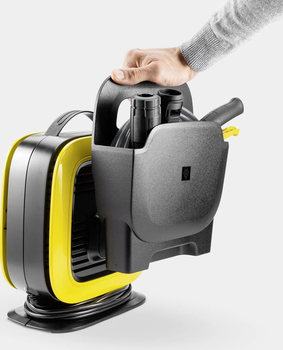 De vijf meter lange extra dunne PremiumFlex hogedrukslang voorkomt vervelende knoopvorming en biedt maximale flexibiliteit en bewegingsvrijheid bij het schoonmaken. Een afneembare accessoirehouder zorgt ervoor dat alle meegeleverde onderdelen eenvoudig kunnen worden opgeborgen. Als je klaar bent met schoonmaken kan de voedingskabel om de standaard van het apparaat worden gewikkeld en met een clip op zijn plaats worden gehouden. Door zijn kleine formaat kan de K Mini zowel binnen als buiten gemakkelijk worden opgeborgen.