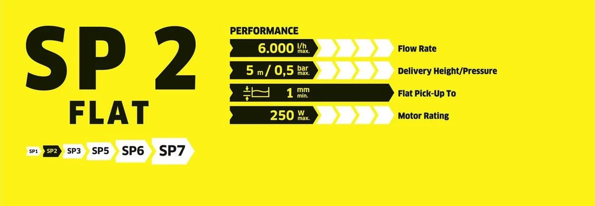 “De SP 2 Flat dompelpomp kan op een betrouwbare manier zuiver tot licht vervuild water wegpompen met vuilpartikels tot een grootte van 5 millimeter. Dankzij zijn pompcapaciteit tot 6.000 l/u, is dit toestle ideaal voor het leegpompen van kleinere zwembaden of kelders die zijn ondergelopen ten gevolge van grondwater of een lek in de wasmachine. Een robuuste glijringafdichting verleent de pomp een lange levensduur. Een vlotterschakelaar schakelt de pomp automatisch aan en uit in functie van het waterpeil, waardoor drooploop wordt vermeden. En dankzij de mogelijkheid om een vlotterschakelaar te monteren, kan deze pomp ook gebruikt worden bij een laag waterpeil en bij continu gebruik. De SP 2 Flat is tevens uitgerust met pootjes die kunnen worden ingeklapt om een grotere capaciteit te verkrijgen. Als de pootjes ingeklapt zijn, start de dompelpomp voor schoon water met pompen aan een waterpeil van slechts 7 millimeter en gaat hij continu door met pompen tot op 1 mm, waardoor het oppervlak dweildroog achterblijft. Met de Quick Connect aansluitdraad kan u 1 1/4″” slangen snel en eenvoudig aansluiten.”