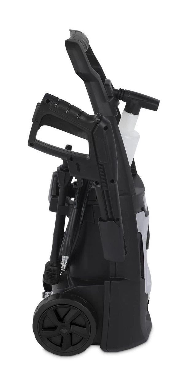 De hogedrukreiniger heeft een stevige handgreep en wieltjes zodat je hem moeiteloos verzet. Het toestel heeft ook een pistoolhouder, zo hang je het pistool en de lans netjes weg als je klaar bent met je klus.